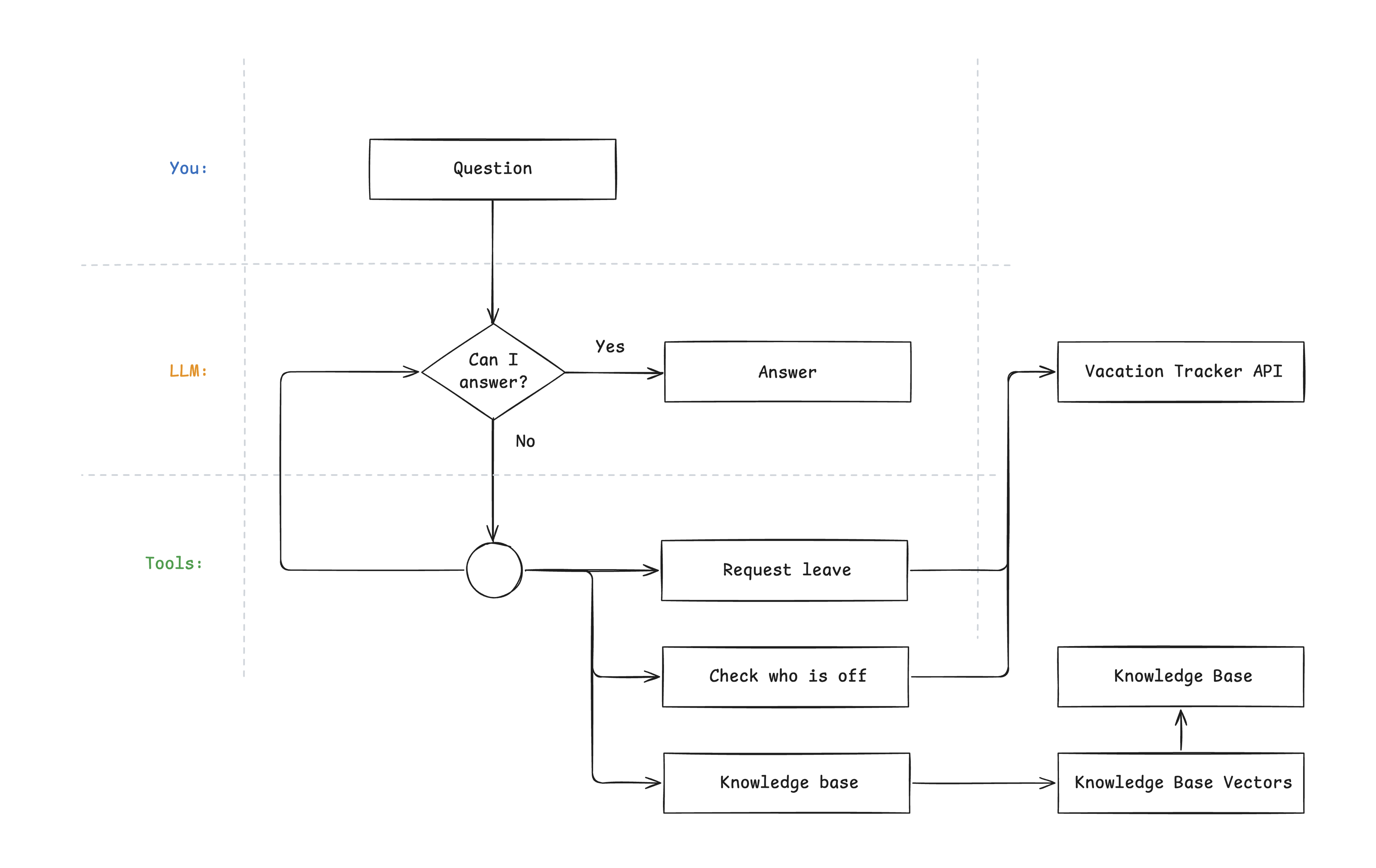 Ok, so, we got the ID of the tool we need to use and the parameters to send to the tool. In this case, an agent wants us to request a leave. In production, we would ask the user to confirm the request details first, but for this simple example, we can send the request straight to the Vacation Tracker API.